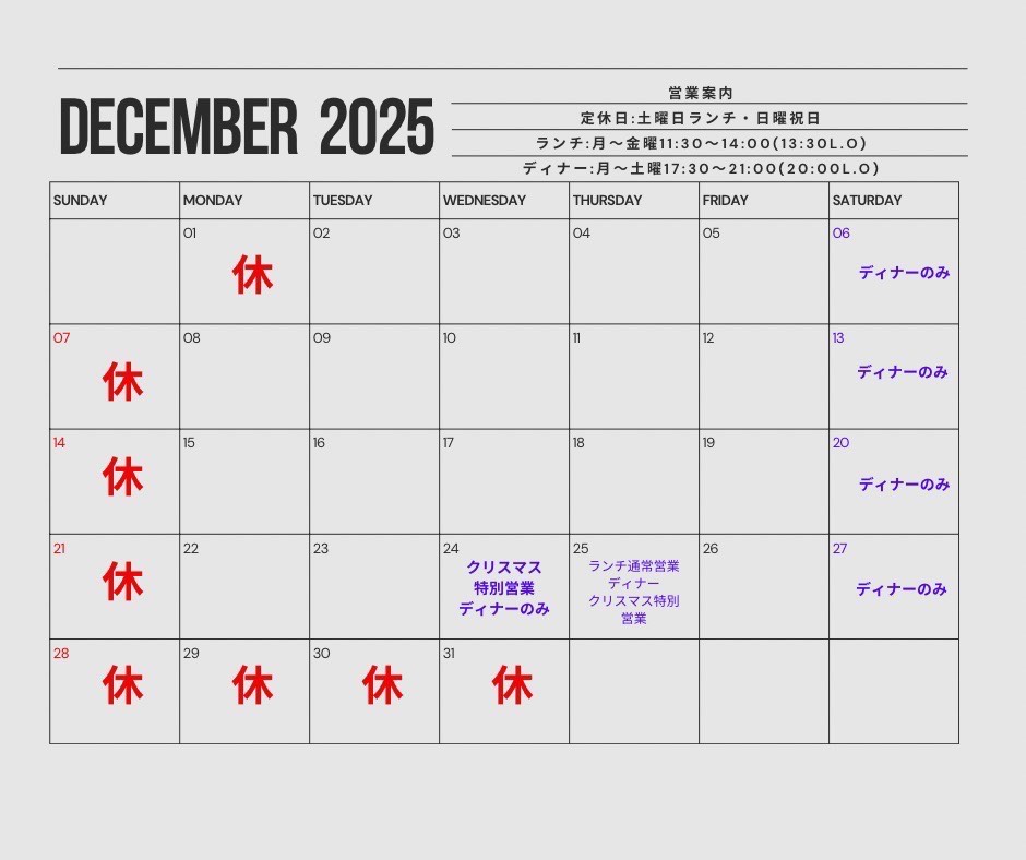 12月の営業日をお知らせいたします。 営業時間や定休日など、詳しくはカレンダーをご確認ください。 皆様のご来店を心よりお待ちしております。