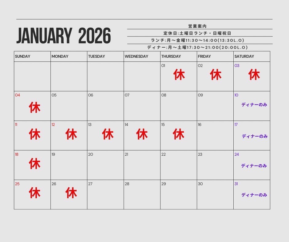 1月の営業日をお知らせいたします。 営業時間や定休日など、詳しくはカレンダーをご確認ください。 皆様のご来店を心よりお待ちしております。