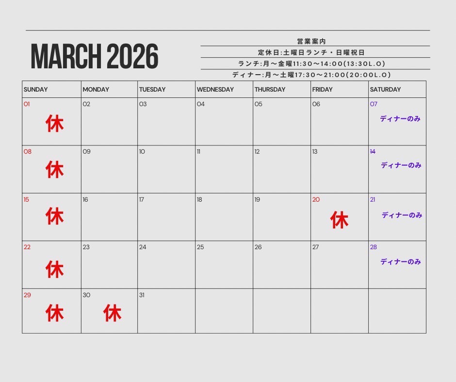3月の営業日をお知らせいたします。 営業時間や定休日など、詳しくはカレンダーをご確認ください。 皆様のご来店を心よりお待ちしております。